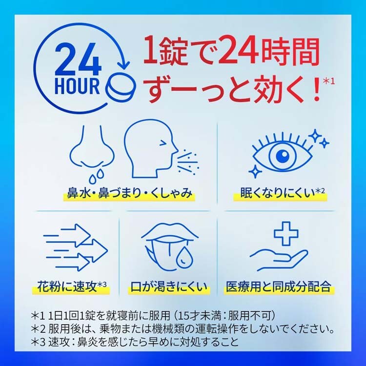 (2)花粉などの季節性のアレルギー性鼻炎症状に使用する場合は、花粉飛散予測日から、又は、症状が出始めたら早めに服用を始めると効果的です。