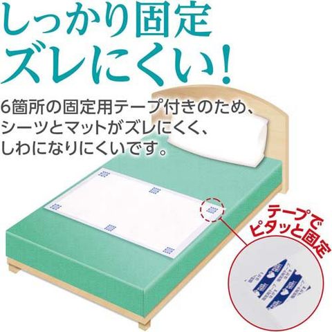 ● 6箇所の固定用テープ付きのため、シーツとマットがズレにくく、しわになりにくいです。