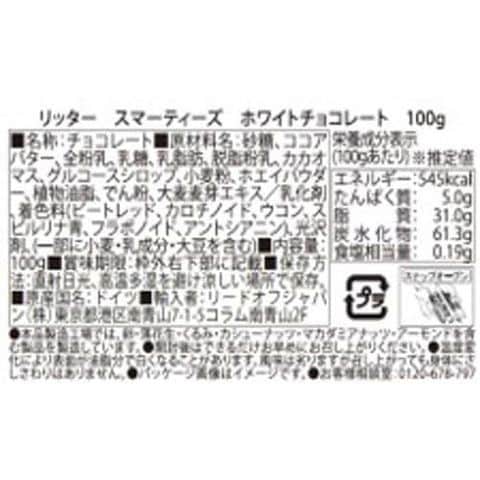 | 砂糖、ココアバター、全粉乳、乳糖、乳脂肪、脱脂粉乳、カカオマス、グルコースシロップ、小麦粉、ホエイパウダー、植物油脂、でん粉、大麦麦芽エキス/乳化剤、着色料(ビートレッド、カロチノイド、ウコン、スピルリナ青、フラボノイド、アントシアニン)、光沢剤(一部に小麦・乳成分・大豆を含む) |