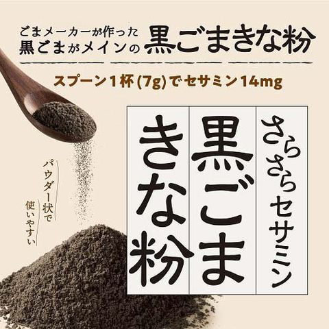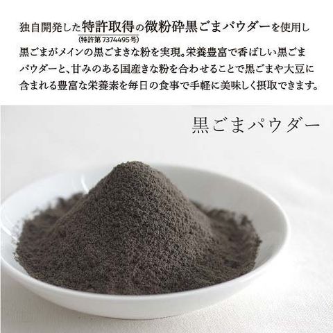 ●特許取得の微粉砕黒ごまパウダーを使用し、大さじ1杯(7g)に黒ごまを約3000粒使用した黒ごまがメインの黒ごまきな粉です。