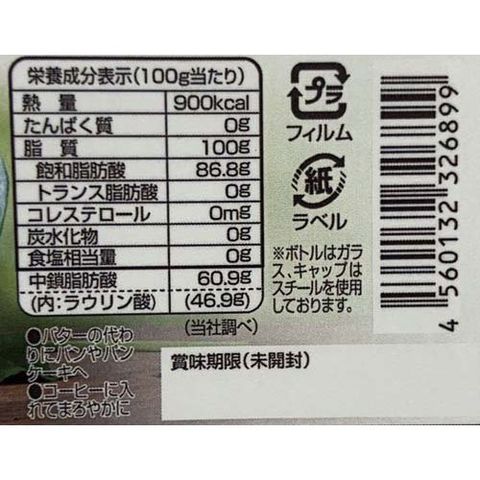 熱量:900kcal、たんぱく質:0g、脂質:100g(飽和脂肪酸:86.8g、トランス脂肪酸:0g)、コレステロール:0mg、炭水化物:0g、食塩相当量:0g、中鎖脂肪酸:60.9g(内 ラウリン酸:46.9g)