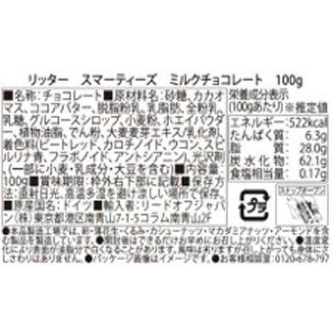 | 砂糖、カカオマス、ココアバター、脱脂粉乳、乳脂肪、全粉乳、乳糖、グルコースシロップ、小麦粉、ホエイパウダー、植物油脂、でん粉、大麦麦芽エキス/乳化剤、着色料(ビートレッド、カロチノイド、ウコン、スピルリナ青、フラボノイド、アントシアニン)、光沢剤(一部に小麦・乳成分・大豆を含む) |