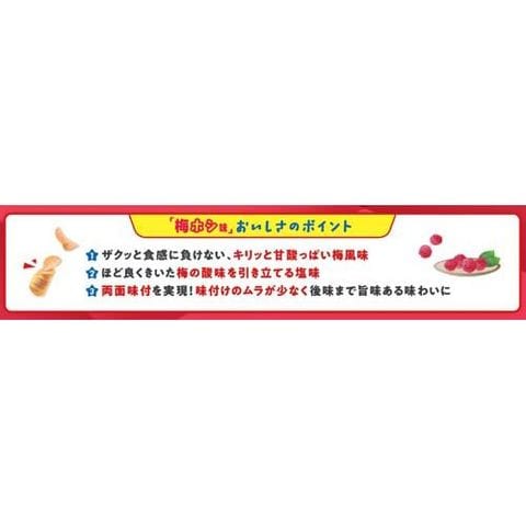 | 乾燥じゃがいも(外国製造)、植物油、食塩、でん粉、砂糖、梅肉パウダー、たん白加水分解物(大豆を含む)、かつおぶしエキスパウダー(さばを含む) / 乳化剤、調味料(アミノ酸等)、酸味料、香料(ゼラチン由来)、ベニコウジ色素、甘味料(ステビア) |