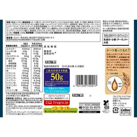 | オーツ麦(オーストラリア又はフィンランド又はその他)、砂糖、ライ麦粉、植物油、デキストリン、ココナッツ、チョコクランチ(小麦粉、砂糖、ショートニング、ココアパウダー、脱脂粉乳、食塩、チョコレート)、クラッシュアーモンド、ココナッツチップ、水溶性食物繊維、アーモンドパウダー、小麦粉、食塩、米粉、小麦ふすま、コーンフラワー、しょうゆ(大豆を含む)、玄米粉、乳糖 / 香料、クエン酸鉄Na、カラメル色素、酸化防止剤(ビタミンC、ビタミンE)、ナイアシン、パントテン酸Ca、膨脹剤、ビタミンA、ビタミンB6、ビタミンB1、漂白剤(亜硫酸塩)、葉酸、ビタミンD、ビタミンB12 |