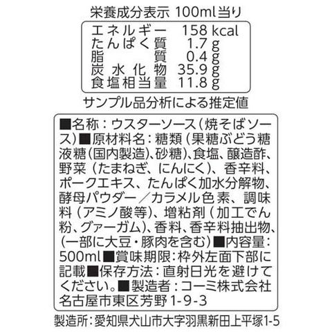 | 糖類(果糖ぶどう糖液糖(国内製造)、砂糖)、食塩、醸造酢、野菜(たまねぎ、にんにく)、香辛料、ポークエキス、たんぱく加水分解物、酵母パウダー/カラメル色素、調味料(アミノ酸等)、増粘剤(加工でん粉、グァーガム)、香料、香辛料抽出物、(一部に豚肉・大豆を含む) |