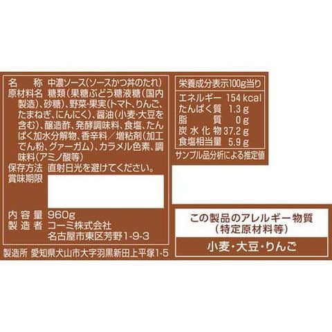 | 糖類(果糖ぶどう糖液糖(国内製造)、砂糖)、野菜・果実(トマト、りんご、たまねぎ、にんにく)、醤油(小麦・大豆を含む)、醸造酢、発酵調味料、食塩、たんぱく加水分解物、香辛料/増粘剤(加工でん粉、グァーガム)、カラメル色素、調味料(アミノ酸等) |