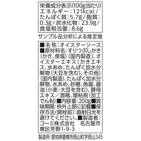 | すりつぶしかき(かき、食塩)(国内製造)、オイスターエキス(かきエキス、水あめ、たんぱく加工水分解物(大豆を含む)、その他)(国内製造)、たんぱく加水分解物、水あめ、砂糖、魚醤、醤油(小麦・大豆を含む)、酵母エキス/酒精、増粘剤(加工でん粉) |