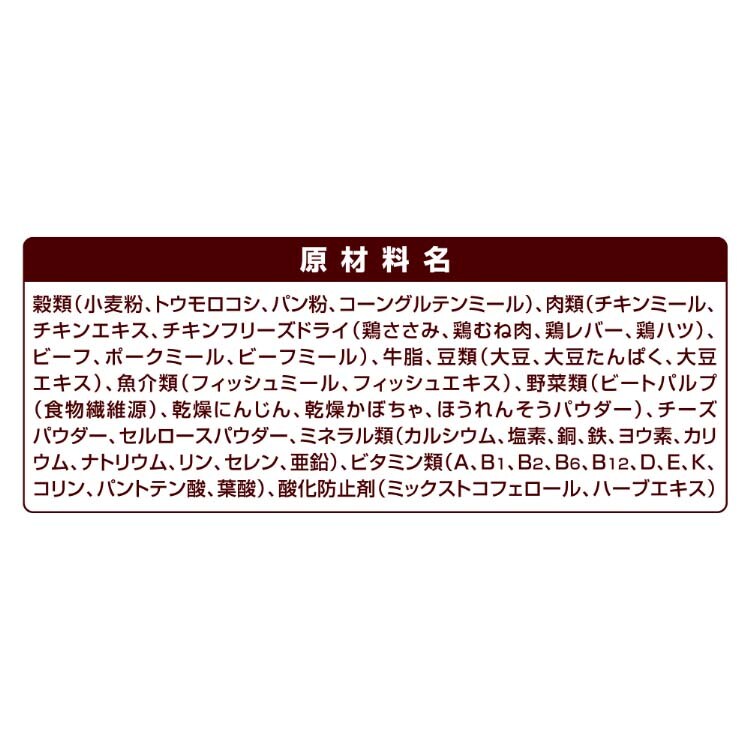 | 穀類(小麦粉、トウモロコシ、パン粉、コーングルテンミール)、肉類(チキンミール、チキンエキス、チキンフリーズドライ(鶏ささみ、鶏むね肉、鶏レバー、鶏ハツ)、ビーフ、ポークミール、ビーフミール)、牛脂、豆類(大豆、大豆たんぱく、大豆エキス)、魚介類(フィッシュミール、フィッシュエキス)、野菜類(ビートパルプ(食物繊維源)、乾燥にんじん、乾燥かぼちゃ、ほうれんそうパウダー)、チーズパウダー、セルロースパウダー、ミネラル類(カルシウム、塩素、銅、鉄、ヨウ素、カリウム、ナトリウム、リン、セレン、亜鉛)、ビタミン類(A、B1、B2、B6、B12、D、E、K、コリン、パントテン酸、葉酸)、酸化防止剤(ミックストコフェロール、ハーブエキス) |