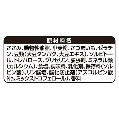 | ささみ、動物性油脂、小麦粉、さつまいも、ゼラチン、豆類(大豆タンパク、大豆エキス)、ソルビトール、トレハロース、グリセリン、膨張剤、ミネラル類(カルシウム)、食塩、調味料、乳化剤、保存料(ソルビン酸)、リン酸塩、酸化防止剤(アスコルビン酸Na、ミックストコフェロール)、香料 |