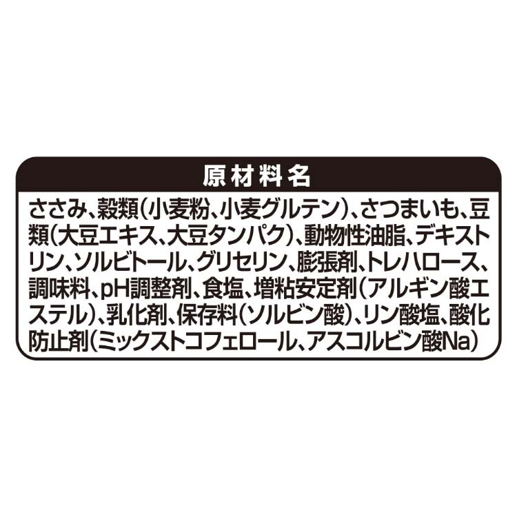 | ささみ、穀類(小麦粉、小麦グルテン)、さつまいも、豆類(大豆エキス、大豆タンパク)、動物性油脂、デキストリン、ソルビトール、グリセリン、膨張剤、トレハロース、調味料、pH調整剤、食塩、増粘安定剤(アルギン酸エステル)、乳化剤、保存料(ソルビン酸)、リン酸塩、酸化防止剤(ミックストコフェロール、アスコルビン酸Na) |