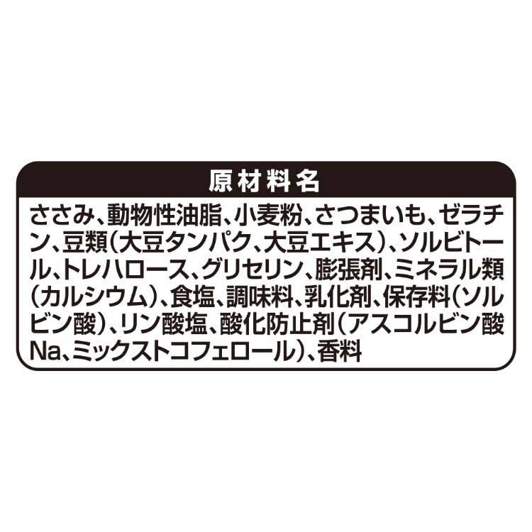 | ささみ、動物性油脂、小麦粉、さつまいも、ゼラチン、豆類(大豆タンパク、大豆エキス)、ソルビトール、トレハロース、グリセリン、膨張剤、ミネラル類(カルシウム)、食塩、調味料、乳化剤、保存料(ソルビン酸)、リン酸塩、酸化防止剤(アスコルビン酸Na、ミックストコフェロール)、香料 |