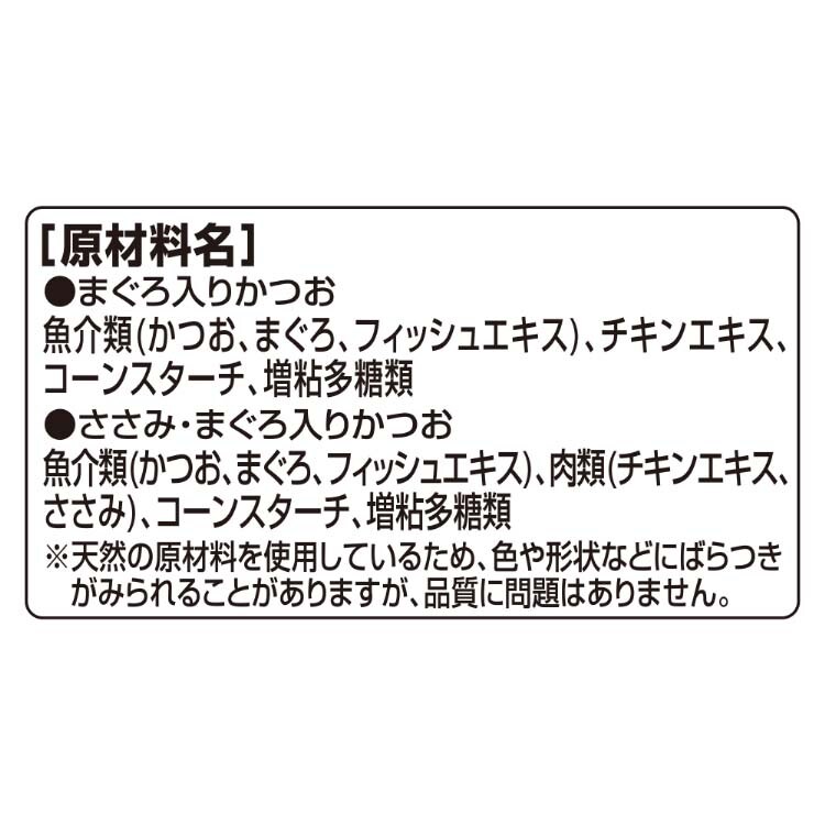 | ★まぐろ入りかつお:魚介類(かつお、まぐろ、フィッシュエキス)、チキンエキス、コーンスターチ、増粘多糖類 ★ささみ・まぐろ入りかつお:魚介類(かつお、まぐろ、フィッシュエキス)、肉類(チキンエキス、ささみ)、コーンスターチ、増粘多糖類※天然の原材料を使用しているため、色や形状などにばらつきがみられることがありますが、品質に問題はありません。 |