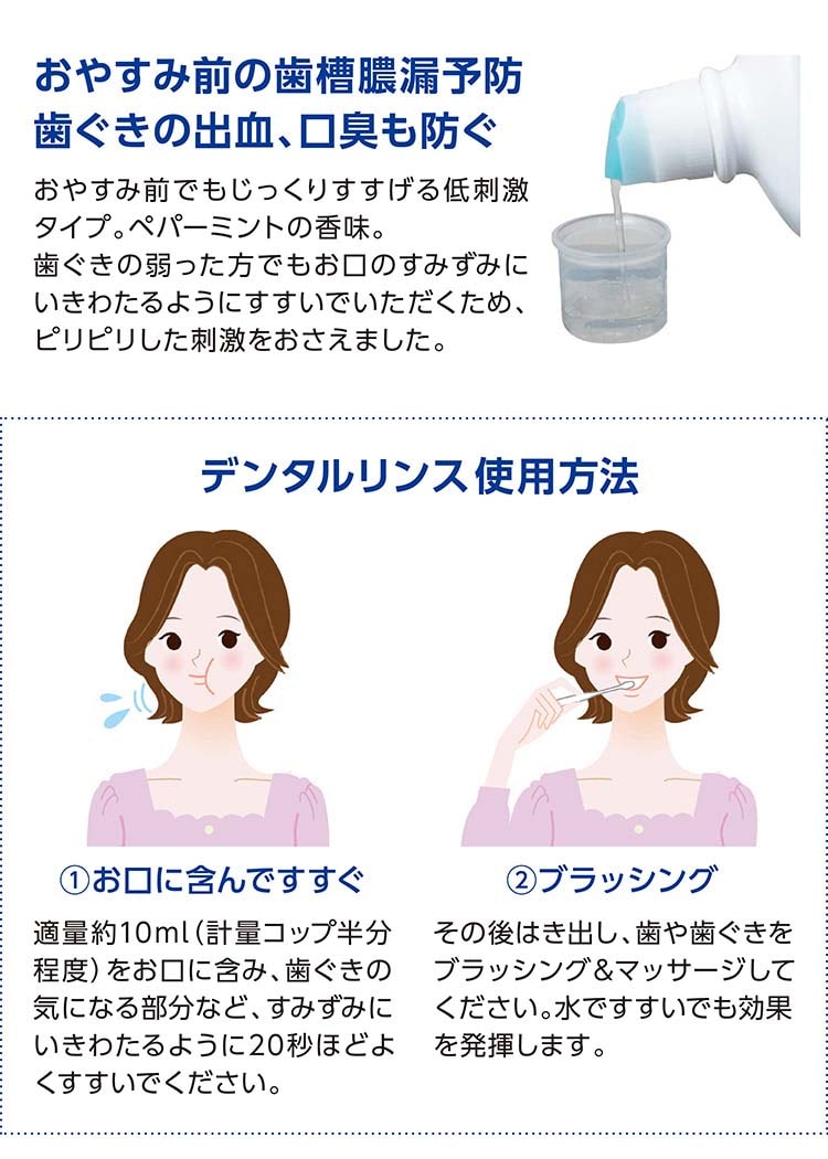 ●3つの働きで歯槽膿漏・歯ぐきの出血・口臭をトータルケアする薬用デンタルリンス。弱ってきた歯ぐきを活性化&修復。