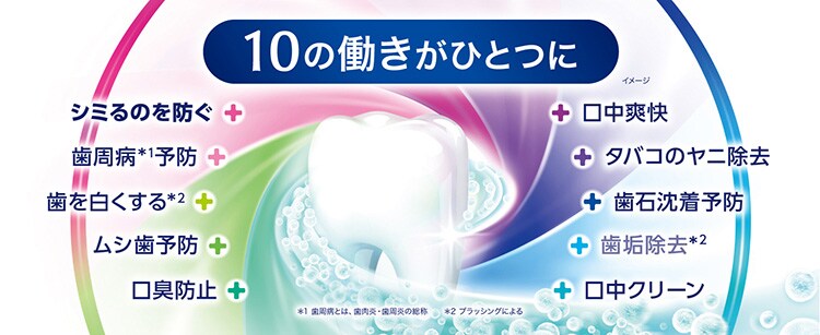 | 歯がしみるのを防ぐ。歯肉炎の予防。歯周炎の予防。ムシ歯の発生および進行の予防。口臭の防止。歯石の沈着を防ぐ、タバコのヤニ除去、歯を白くする。口中を浄化する。口中を爽快にする。 |