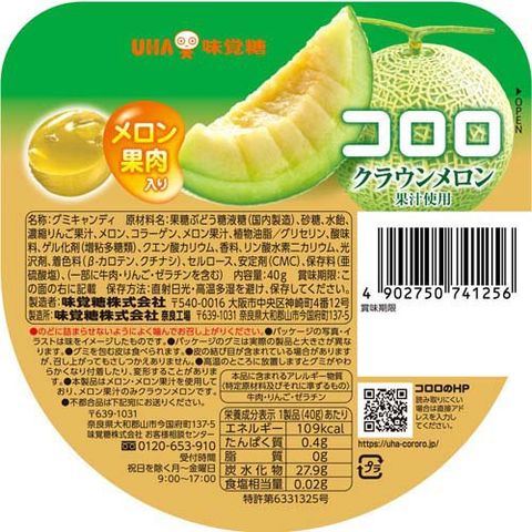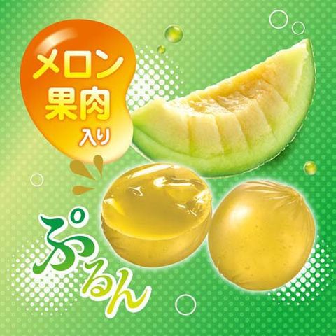 | 果糖ぶどう糖液糖(国内製造)、砂糖、水飴、濃縮りんご果汁、メロン、コラーゲン、メロン果汁、植物油脂/グリセリン/酸味料、ゲル化剤(増粘多糖類)、クエン酸カリウム、香料、リン酸水素二カリウム、光沢剤、着色料(β-カロテン、クチナシ)、セルロース、安定剤(CMC)、保存剤(亜硫酸塩)、(一部に牛肉・りんご・ゼラチンを含む) |