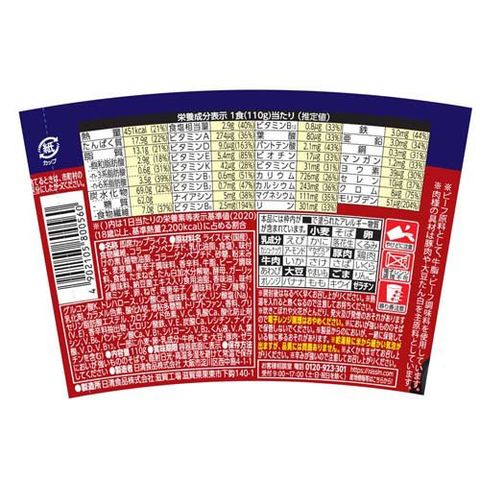 | 1食(110g)当たり(推定値) エネルギー:451kcal(21%)、たんぱく質:17.9g(22%)、脂質:13.1g(21%)、飽和脂肪酸:2.9g(18%)、n-3系脂肪酸:0.6g(31%)、n-6系脂肪酸:3.5g(39%)、炭水化物:69.0g(22%)、糖質:62.0g、食物繊維:7.0g(37%)、食塩相当量:2.9g(40%)、ビタミンA:274μg(36%)、ビタミンD:9.0μg(163%)、ビタミンE:5.4mg(85%)、ビタミンK:42μg(28%)、ビタミンB1:0.6mg(51%)、ビタミンB2:0.7mg(47%)、ナイアシン:5mg(38%)、ビタミンB6:2.5mg(194%)、ビタミンB12:0.8μg(33%)、葉酸:80μg(33%)、パントテン酸:2.1mg(43%)、ビオチン:17μg(33%)、ビタミンC:31mg(31%)、カリウム:726mg(26%)、カルシウム:243mg(36%)、マグネシウム:111mg(35%)、リン:301mg(33%)、鉄:3.0mg(44%)、亜鉛:3.0mg(34%)、銅:0.3mg(31%)、マンガン:1.2mg(33%)、ヨウ素:39μg(30%)、セレン:10μg(37%)、クロム:8μg(75%)、モリブデン:51μg(204%)※()内は1日当たりの栄養素等表示基準値(2020)(18歳以上、基準熱量2.200kcal)に占める割合 |