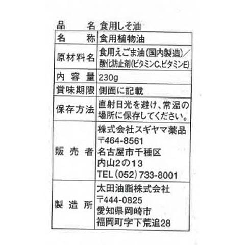 ・スギヤマのしそ油はビタミンCとビタミンEを酸化防止のために少し加えてありますので200度までの加熱料理にお使いいただけますが、加熱しすぎますと魚のような生臭いにおいがしますのでご注意ください。
