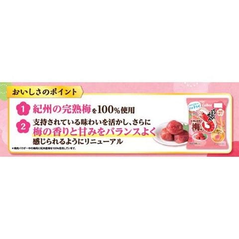 ●かっぱえびせんの冬の梅味。梅は紀州の完熟梅100%で絶妙な酸味が、やめられない、とまらない味わいです。