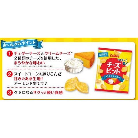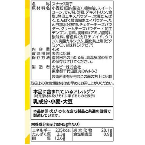 | 小麦粉(国内製造)、植物油、スイートコーン、でん粉、砂糖、デキストリン、食塩、酵母エキスパウダー、大豆たんぱく、たんぱく質濃縮ホエイパウダー、たん白加水分解物、チェダーチーズパウダー、クリームチーズパウダー / 加工デンプン、香料、調味料(アミノ酸等)、酸味料、着色料(カロチノイド、ウコン)、炭酸カルシウム、酸化防止剤(ビタミンC)、甘味料(ステビア) |