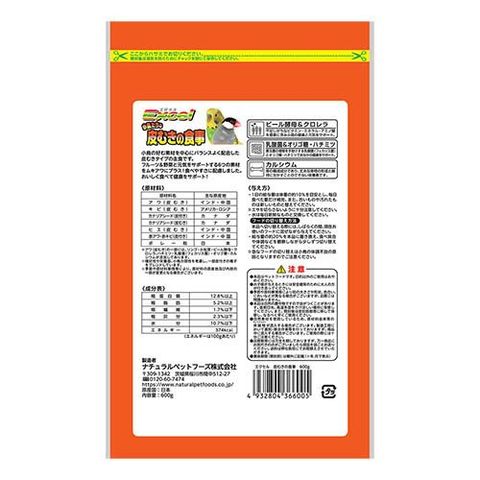 | 水分:10.7%以下、粗蛋白質:12.8%以上、粗脂肪:5.2%以上、粗繊維:1.7%以下、粗灰分:2.3%以下、エネルギー:374kcal/100g |