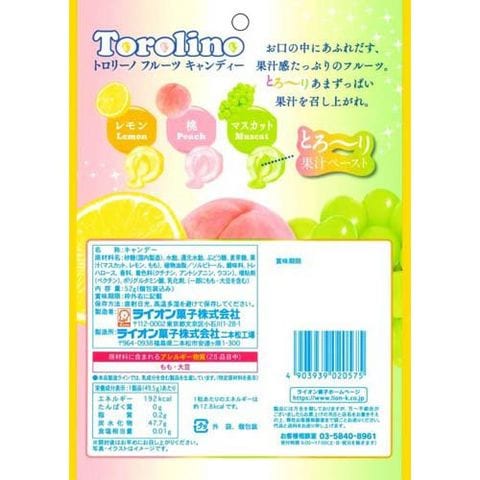 | 砂糖(国内製造)、水飴、還元水飴、ぶどう糖、麦芽糖、果汁(マスカット、レモン、もも)、植物油脂/ソルビトール、酸味料、トレハロース、香料、着色料(クチナシ、アントシアニン、ウコン)、増粘剤(ペクチン)、ポリグルタミン酸、乳化剤、(一部にもも・大豆を含む) |