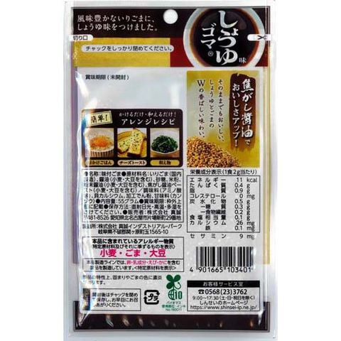 | いりごま(国内製造)、醤油(小麦・大豆を含む)、砂糖、米粉、粉末醤油(小麦・大豆を含む)、焦がし醤油ペースト(小麦・大豆を含む)/調味料(アミノ酸等)、貝カルシウム、加工でん粉、甘味料(カンゾウ) |