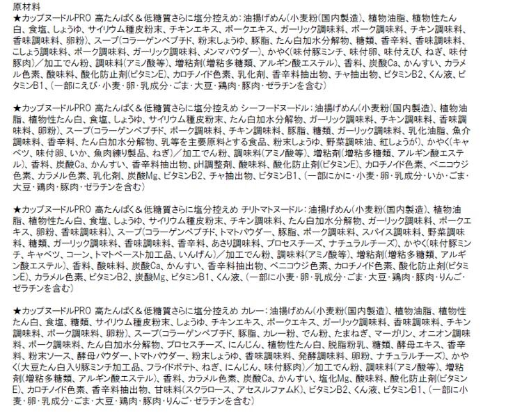 | ★カップヌードルPRO 高たんぱく&低糖質さらに塩分控えめ:えび、小麦、卵、乳、ごま、大豆、鶏肉、豚肉、ゼラチン ★カップヌードルPRO 高たんぱく&低糖質さらに塩分控えめ シーフードヌードル:かに、小麦、卵、乳、いか、ごま、大豆、鶏肉、豚肉、ゼラチン ★カップヌードルPRO 高たんぱく&低糖質さらに塩分控えめ チリトマトヌードル:小麦、卵、乳、ごま、大豆、鶏肉、豚肉、りんご、ゼラチン ★カップヌードルPRO 高たんぱく&低糖質さらに塩分控えめ カレー:小麦、卵、乳、ごま、大豆、鶏肉、豚肉、りんご、ゼラチン |