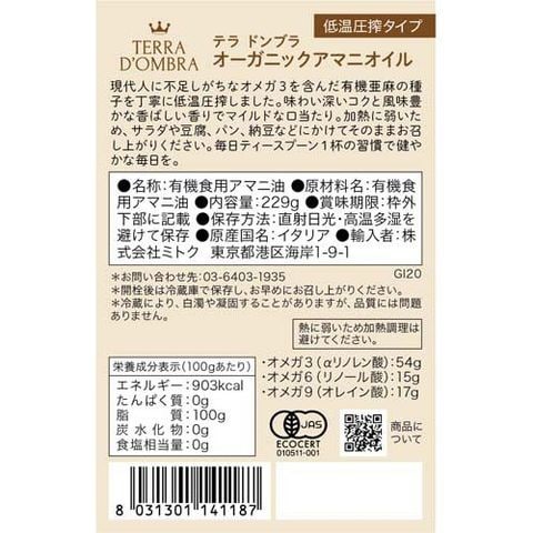 【テラ ドンブラ オーガニックアマニオイル 低温圧搾タイプの商品詳細】