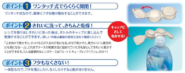 (1)ソフトコンタクトレンズに、本剤を数滴つけて、レンズの両面を各々、20~30回指で軽くこすりながら洗います。