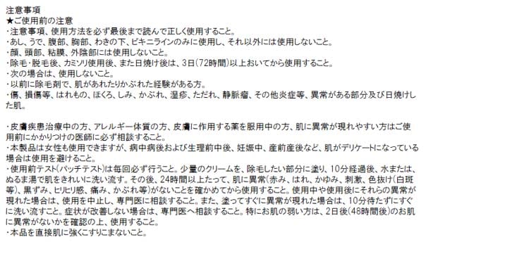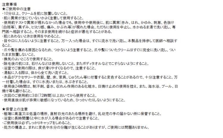 ※除毛の際は塗り始めてから最大10分を超えない範囲で使用すること。(除毛時間はムダ毛の量や毛質により個人差がある)
