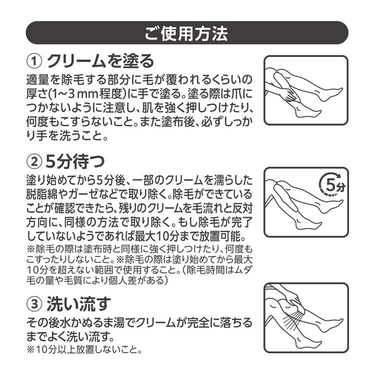 ※除毛の際は塗り始めてから最大10分を超えない範囲で使用すること。(除毛時間はムダ毛の量や毛質により個人差がある)
