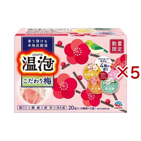 | ・華やかな白花梅の香り:ウォームイエローの湯色(色付き透明)5錠 ・甘酸っぱい杏花梅の香り:ウォームオレンジの湯色(色付き透明)5錠 ・さわやかな青花梅の香り:ライトグリーンの湯色(色付き透明)5錠 ・気品高い紅花梅の香り:マイルドレッドの湯色(色付き透明)5錠 |