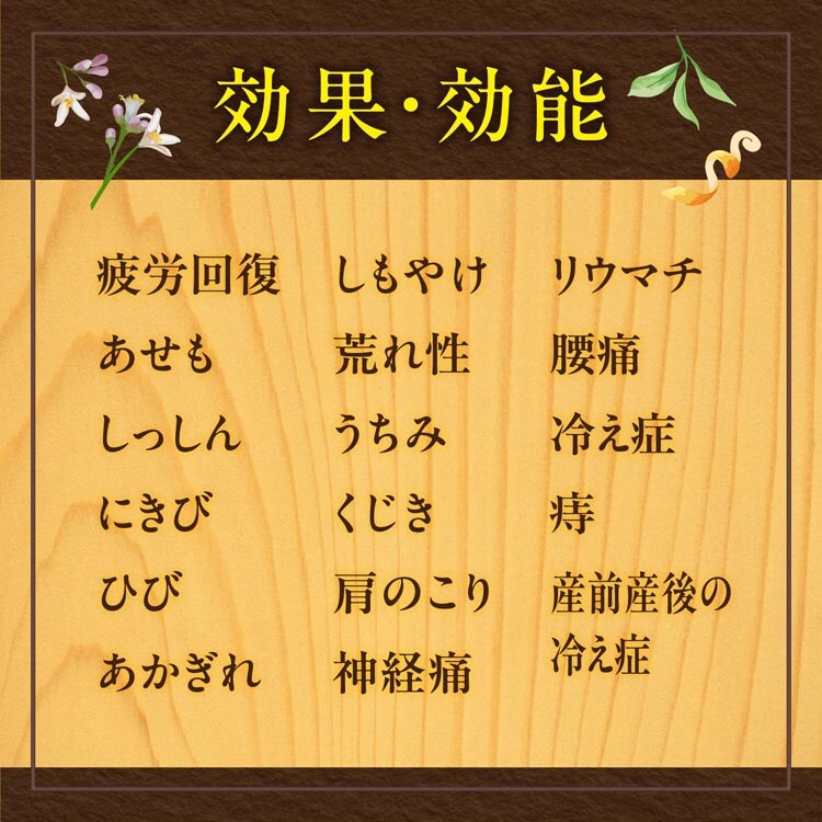 | 疲労回復、あせも、しっしん、にきび、ひび、あかぎれ、しもやけ、荒れ性、うちみ、くじき、肩のこり、神経痛、リウマチ、腰痛、冷え症、痔、産前産後の冷え症 |