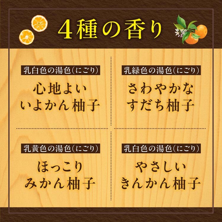 ●心地良い いよかん柚子の香り:果汁感あふれるいよかんと、もぎたての柚子の香りをブレンド。気分を潤してくれるような、みずみずしい香りです。「乳白色の湯色(にごり)」