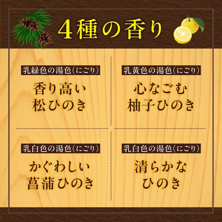 ●清らかなひのきの香り:気持ちがやすらぐ厳かなひのきの香り。贅沢な気分を味わいながら、心落ちつく香りです。「乳白色の湯色(にごり)」