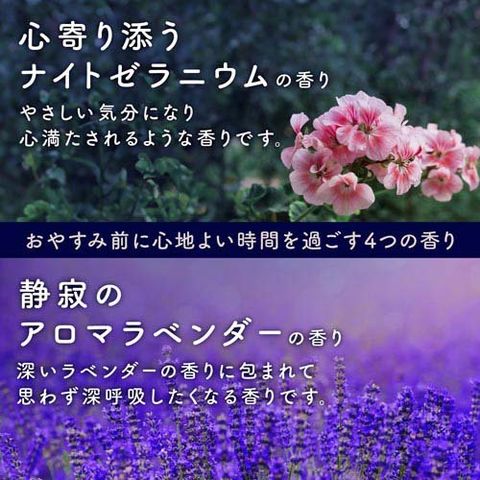 ●心寄り添うナイトゼラニウムの香り:ラベンダーに華やかなゼラニウムの香りをブレンド。心満たされるような香りです。「スイートピンクの湯色(色付き透明)」
