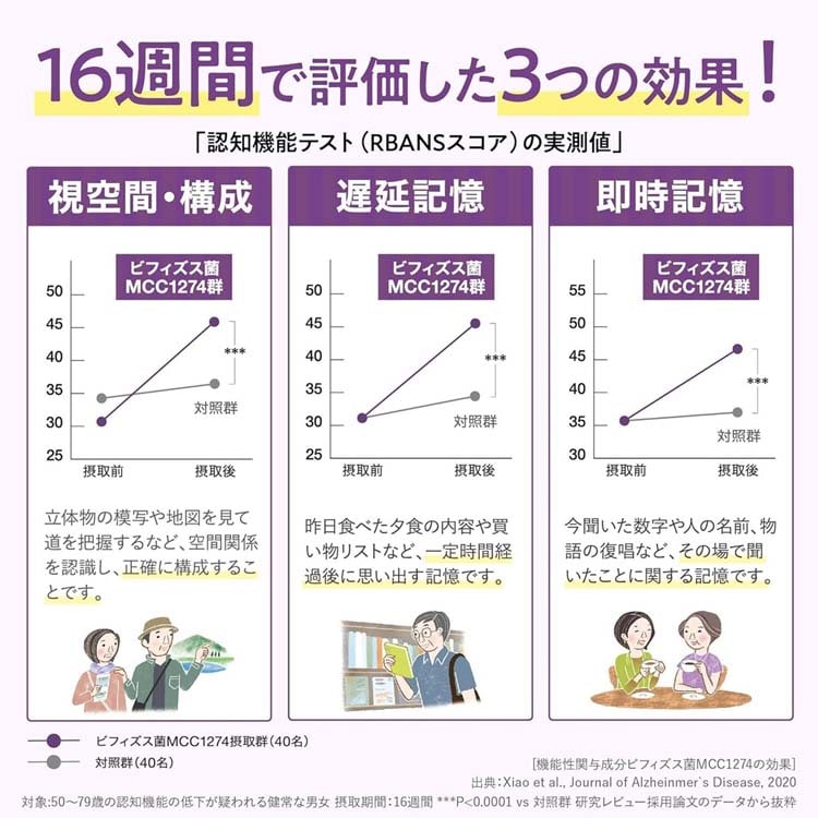 届出表示:本品にはビフィズス菌MCC1274が含まれるので、健常な中高年の方の加齢に伴い低下する認知機能の一部である記憶力、空間認識力を維持する機能があります。※記憶力とは、見たり聞いたりした内容を記憶し、思い出す力のことです。