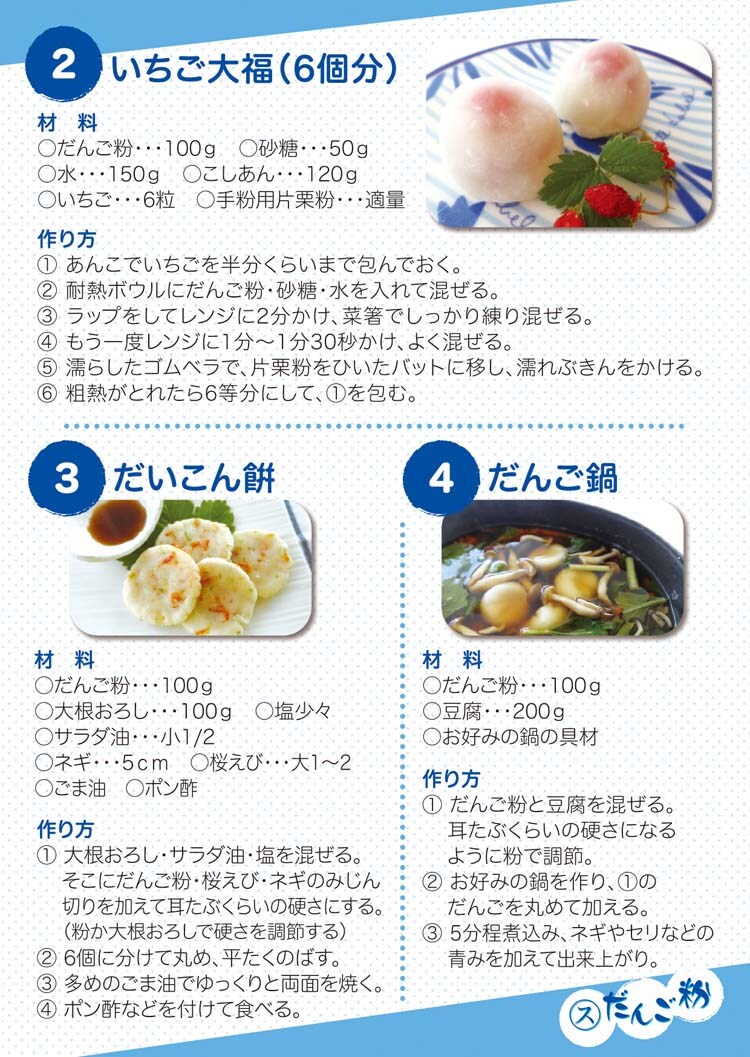 ●おだんごはもちろん、クレープ、鍋の具、ニョッキ、大福などいろんな料理に使えます。