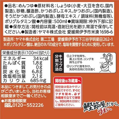 しょうゆ(小麦・大豆を含む、国内製造)、砂糖、醸造酢、かつおぶしエキス、かつおぶし(国内製造)、そうだかつおぶし(国内製造)、酵母エキス / 調味料(無機塩等)、ポリグルタミン酸
