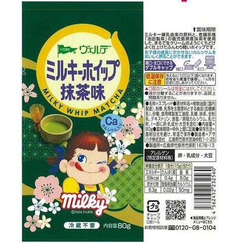 ●ミルキー練乳由来の原料と、鹿児島県産抹茶を使用した、まるで生クリームのようにくちどけよく仕上げたふんわり軽いホイップです。