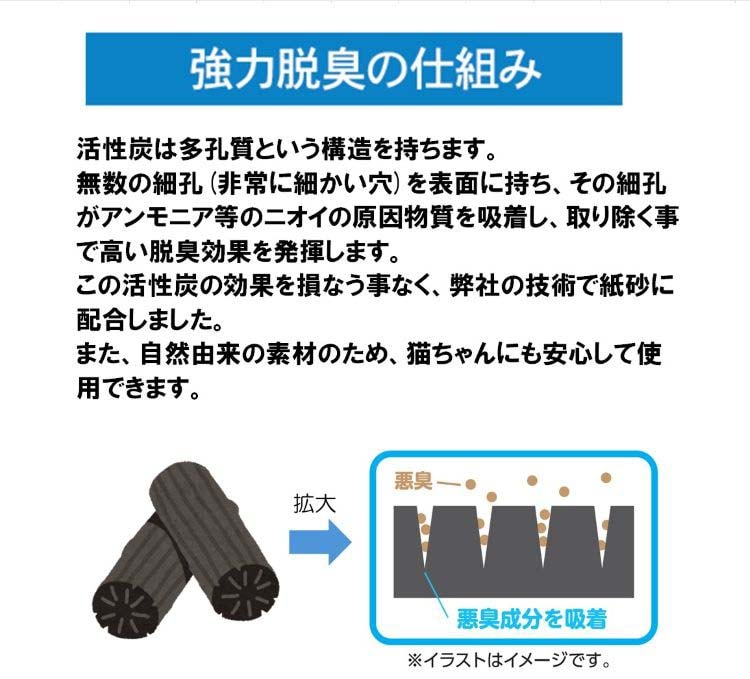 ●この活性炭の効果を損なうことなく、紙砂に配合しました。また、自然由来の素材のため、猫ちゃんにも安心して使用できます。