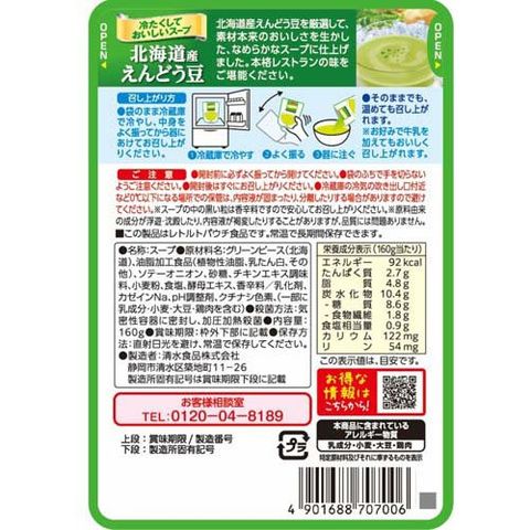 ●北海道産えんどう豆を厳選して、素材本来のおいしいを生かした、なめらかなスープに仕上げました。