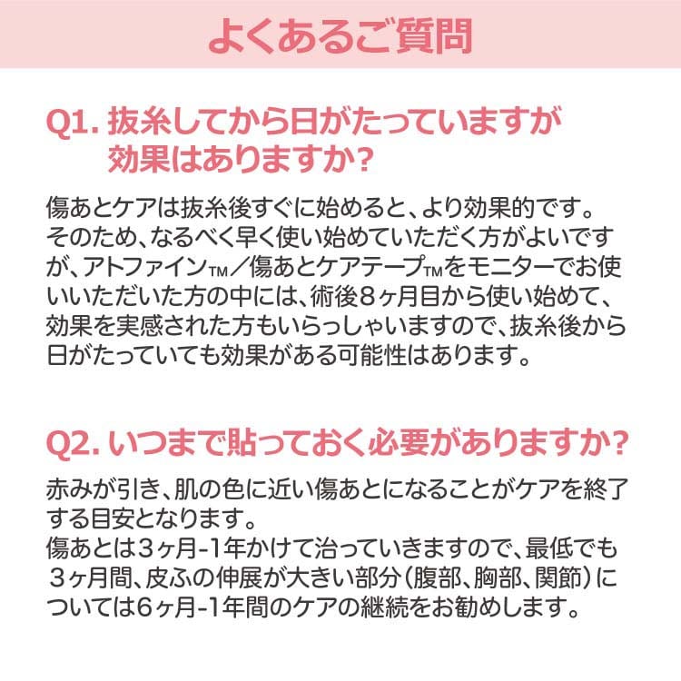 ・その際は、「傷あと」を傷つけないようご注意ください。 皮膚かぶれやはがれの原因になりますので、テープは引っ張らずにお貼り下さい。