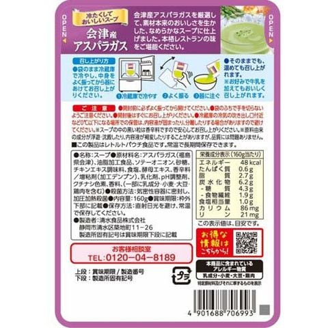 | アスパラガス(福島県会津)、油脂加工食品、ソテーオニオン、砂糖、チキンエキス調味料、食塩、酵母エキス、香辛料/増粘剤(加工デンプン)、乳化剤、pH調整剤、クチナシ色素、香料、(一部に乳成分・小麦・大豆・鶏肉を含む) |