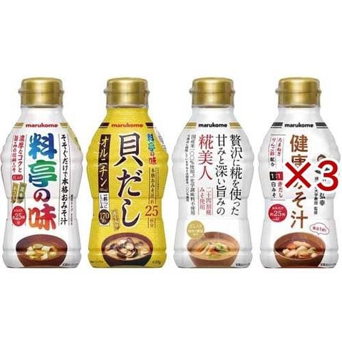 | 液みそ 料亭の味430g*1本、液みそ 貝だし430g*1本、液みそ 糀美人430g*1本、液みそ 健康みそ汁430g*1本 計4種4本 |