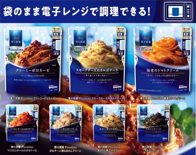 ●青の洞窟の「贅沢なおいしさ」はそのままに、電子レンジ調理可能になったパスタソース5種類と早ゆでパスタ1.6mm 長さ2/3サイズのセット。