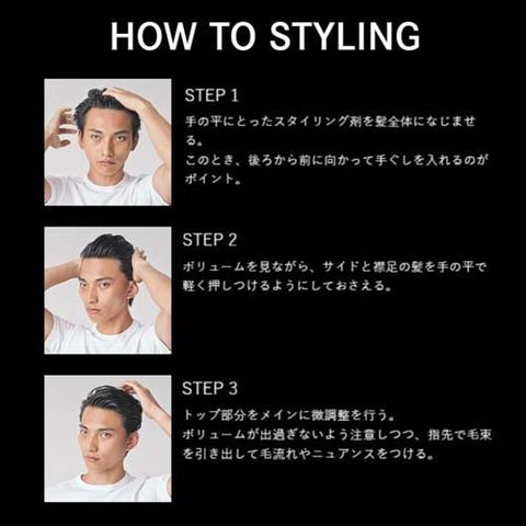 ・手のひらで適量を十分にのばしてから、髪に均一になじませて整髪します。(部分的に多くつきすぎると、白い粉が出ることがあります)
