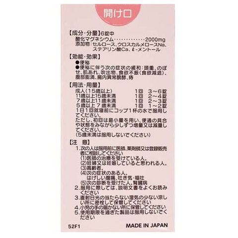 | 6錠中 成分:含量 酸化マグネシウム:2000mg 添加物:セルロース、クロスカルメロースNa、ステアリン酸Ca、l-メントール |