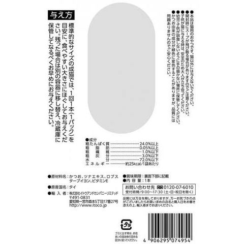 | 粗たんぱく質:24.0%以上、粗脂肪:0.05%以上、粗繊維:1.0%以下、粗灰分:3.0%以下、水分:72.0%以下、エネルギー:約25Kcal/1袋あたり |