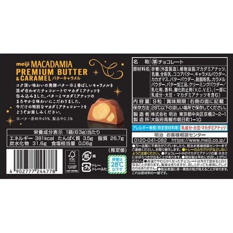 | 砂糖(外国製造)、植物油脂、マカダミアナッツ、乳糖、全粉乳、ココアバター、キャラメルパウダー、カカオマス、バターパウダー、脱脂粉乳、カラメルパウダー、バター加工品、クリーミングパウダー/乳化剤、香料、酸化防止剤(V.C、V.E)、(一部に乳成分・大豆・マカダミアナッツを含む) |